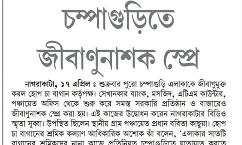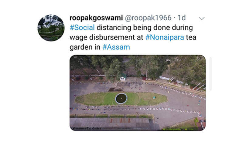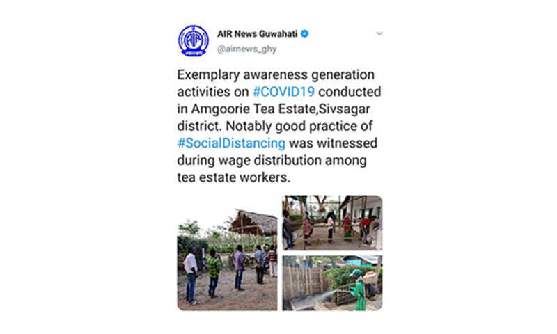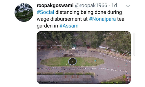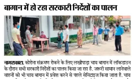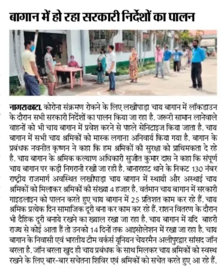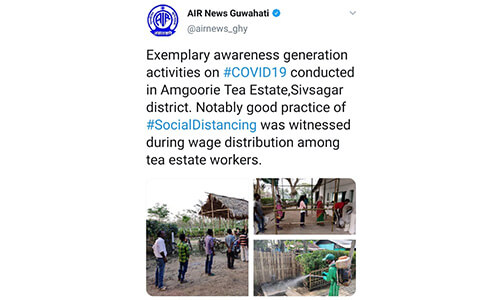 On 20.04.2020, Asst Labour Commissioner Sivsagar and Medical Inspector-Plantations visited Borpatra Tea Garden (field and factory) to review implementation of Govt. guidelines and found all arrangements satisfactory