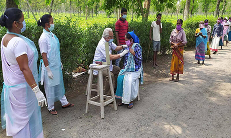 Temperature check of all the workers at plucking mela by thermal gun by the garden medical team